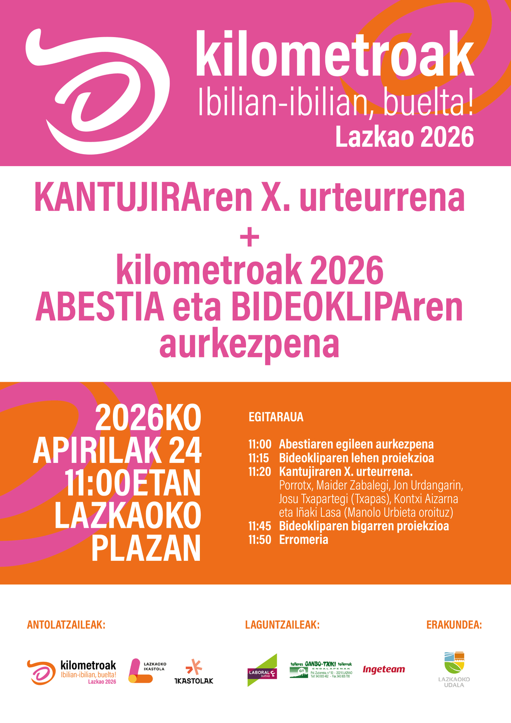 Goizeko 11:00etan, herriko plazan, Kantujiraren X. urteurreneko ekitaldia ospatuko dugu, eta momentu horretan Kilometroak 2026ko abestia eta bideoklipa aurkeztuko ditugu. Hilabeteetako lanaren emaitza izango da, eta benetan une garrantzitsua da guretzat.