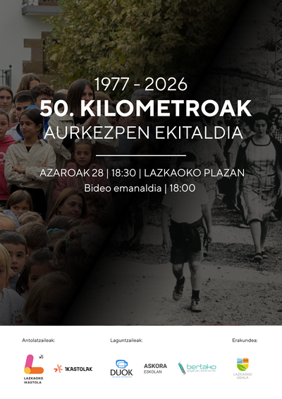 1977-2026. 50.Kilometroak. Aurkezpen ekitaldia. Azaroak 28 / 18:30ean / Lazkaoko plazan/Bideo emanaldia / 18:00ean